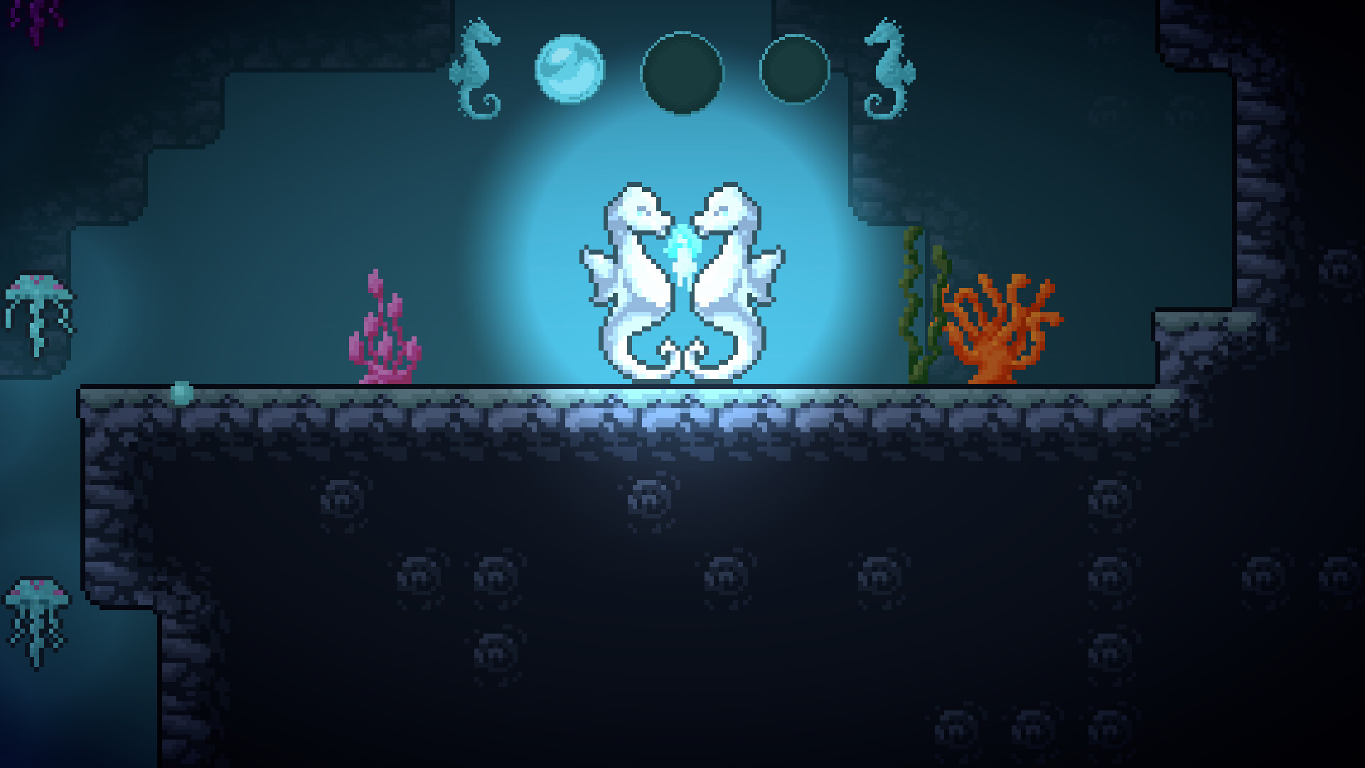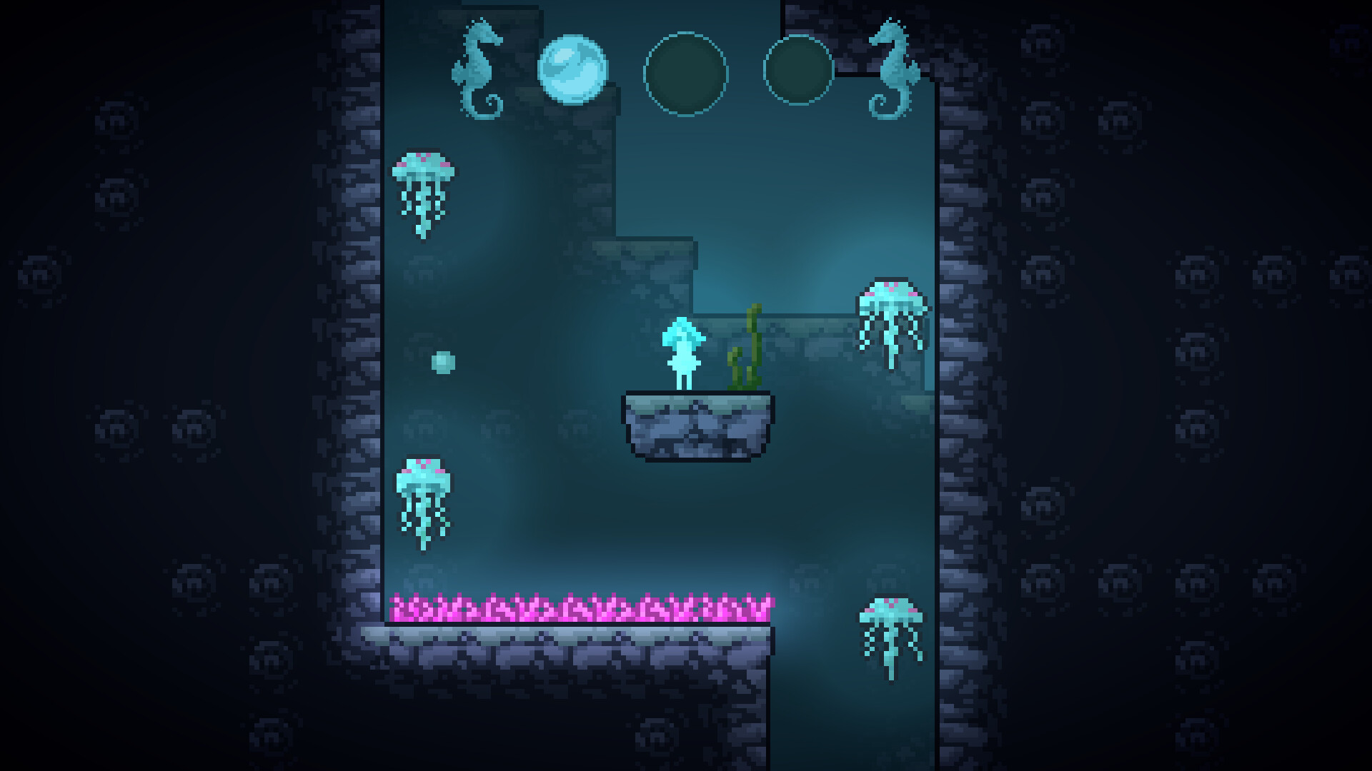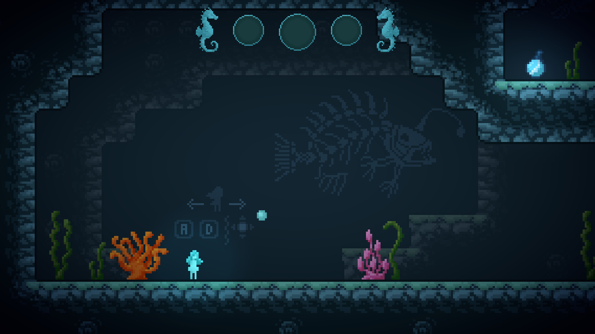 In this short Pixelplatformer, you take over the role of a little waterghost namend Kymo. When Kymo became a ghost she lost all memories of her past life. Now it is your responsibility to help her find them.